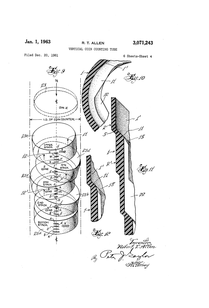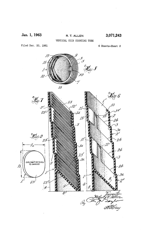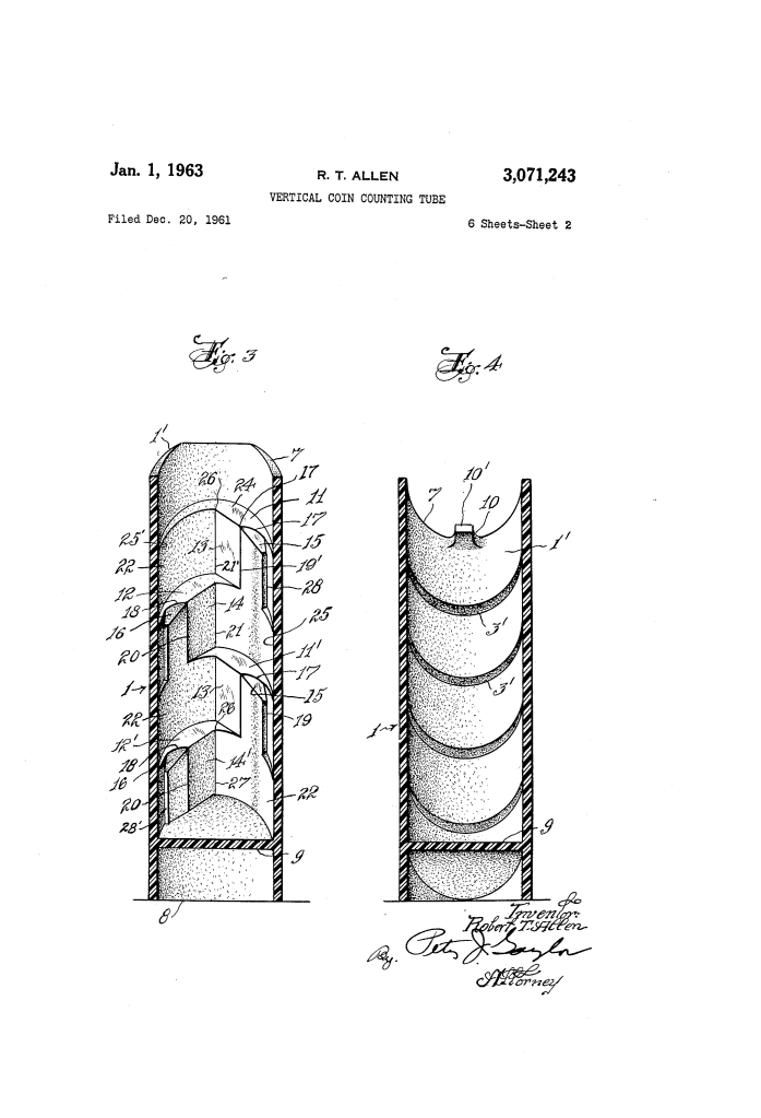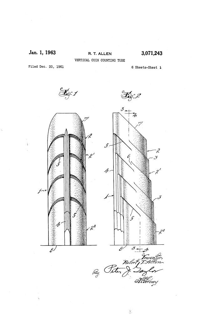 The Vertical Coin Counting Tube (U.S. Patent 3,071,243), granted on January 1, 1963, to Robert T. Allen, is a precision device designed for the rapid and accurate counting of coins in a vertical stack. Unlike traditional flat trays, this tube uses gravity and a unique interior geometry to ensure that only a specific, predetermined number of coins can occupy each section.
