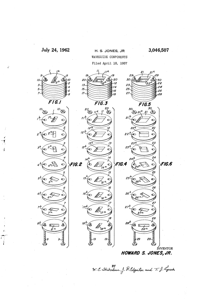 U.S. Patent No. 3,046,507, granted on July 24, 1962, to Howard S. Jones, Jr., describes an innovative method for fabricating complex microwave waveguide components. At the time, creating waveguides with “odd” shapes—such as twists or transformers—was extremely expensive and difficult because traditional machining couldn’t always maintain the precise internal tolerances needed for a clean signal (impedance match).