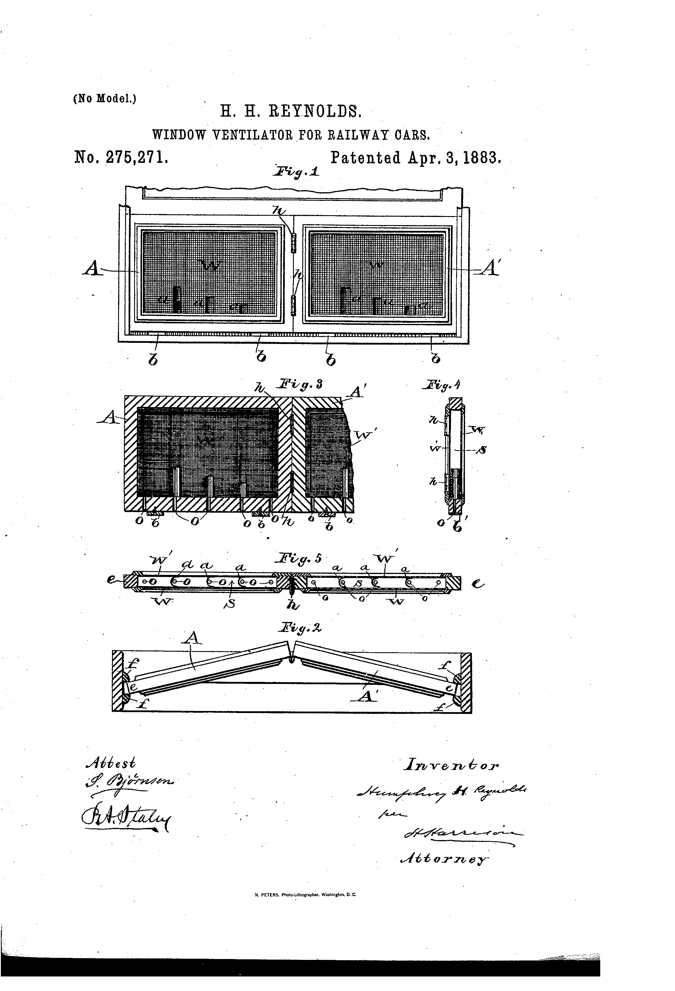 Window ventilator for railroad cars -Humphrey H. Reynolds- 1883 – Patent: US275271A