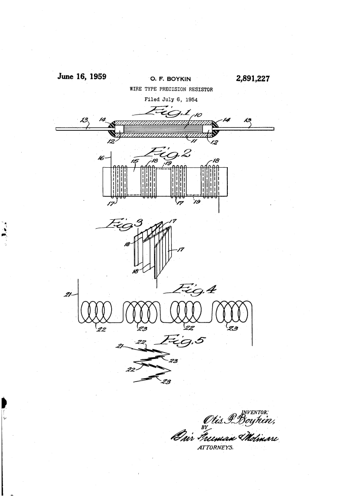 U.S. Patent No. 2,891,227, granted on June 16, 1959, to Otis F. Boykin, introduces a sophisticated design for high-precision electrical resistors. Boykin, an inventor and engineer based in Chicago, Illinois, developed this wire-type resistor to overcome the technical limitations of traditional components used in the rapidly advancing electronics and aerospace industries.